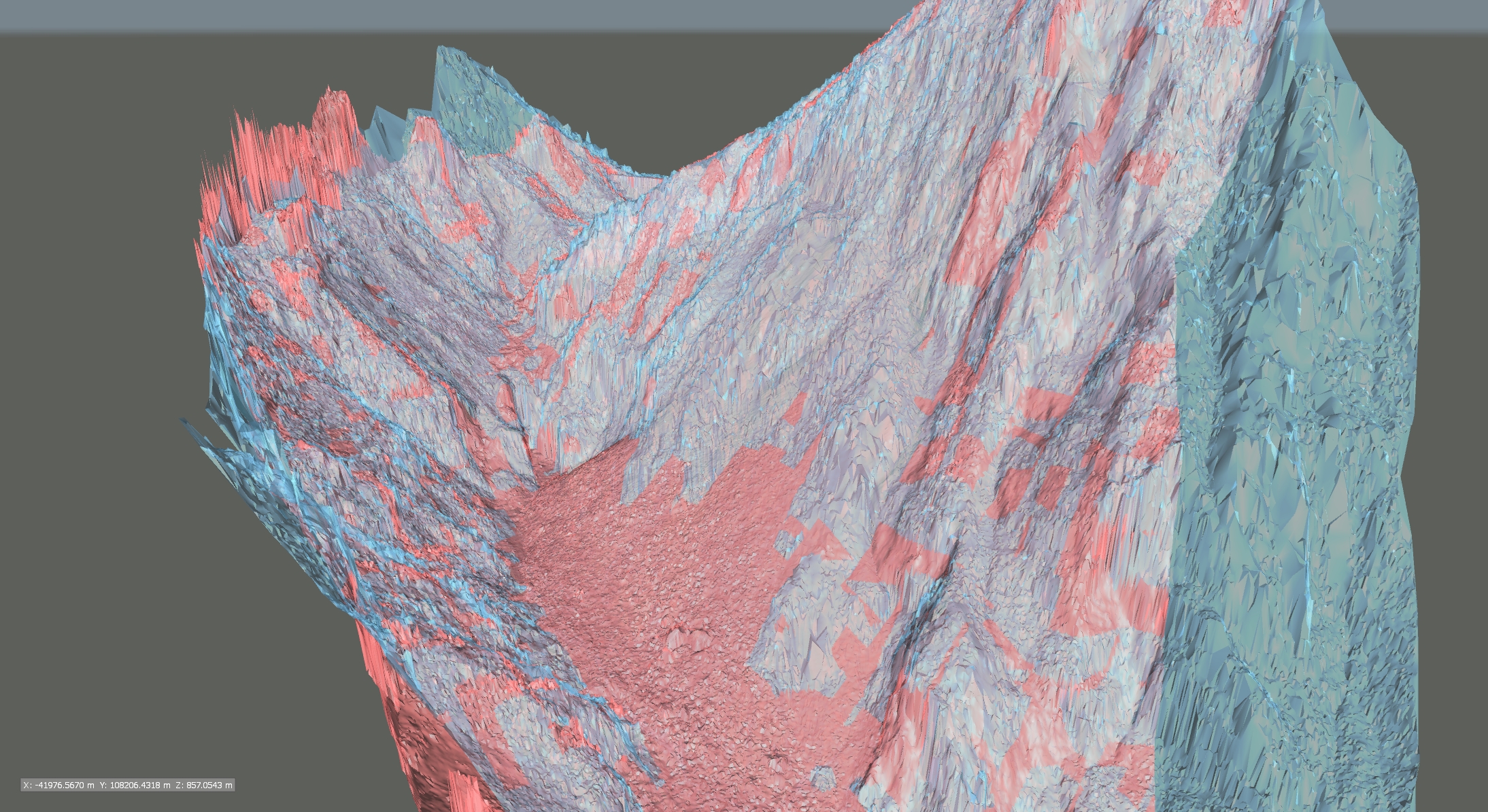 谷壁の大崩壊によって焼山川5号砂防堰堤の堆砂域に大量の土砂が流入、作業はこの流入した土砂量を算出するものだった。崩壊前(10年前)と崩壊後(現在)の点群データがあったため、それぞれサーフェス化して比較することで短時間で目的を達成した。